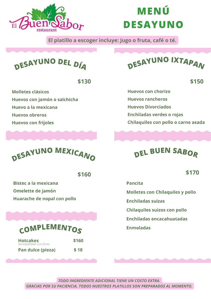Introducing the menu at El Buen Sabor, a hidden gem located in Ixtapan de la Sal, is an experience that promises to tantalize your taste buds. This charming restaurant offers a delightful array of dishes, including hearty desayunos (breakfasts) and satisfying almuerzos (lunches), perfect for any time of day.